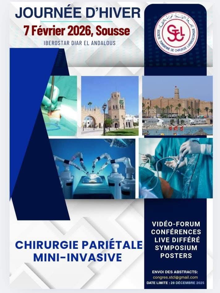 La Société Tunisienne de Chirurgie Laparoscopique (STCL) annonce la tenue de sa Journée d’Hiver 2026, qui se déroulera le samedi 7 février 2026 à Sousse.